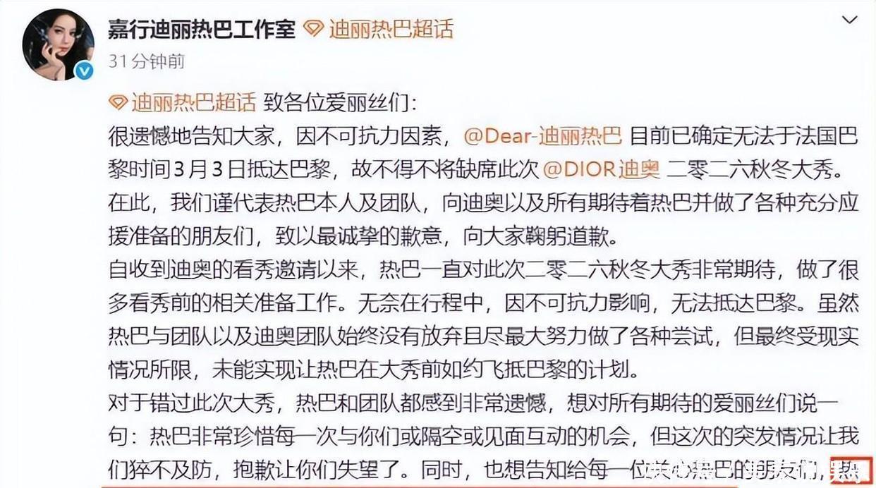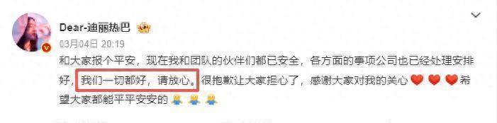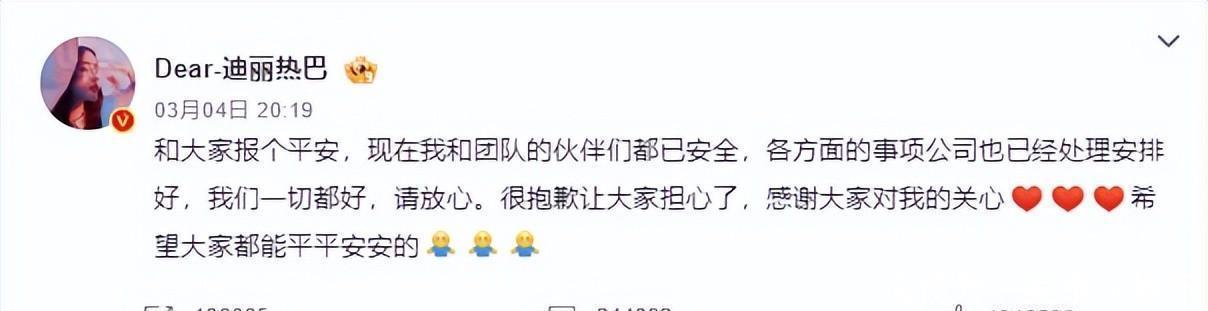 3月4日晚上,热巴发了条很短的动态:“我们一切都安好,请放心。”看到这句,等消息等到失眠的粉丝终于能喘口气。